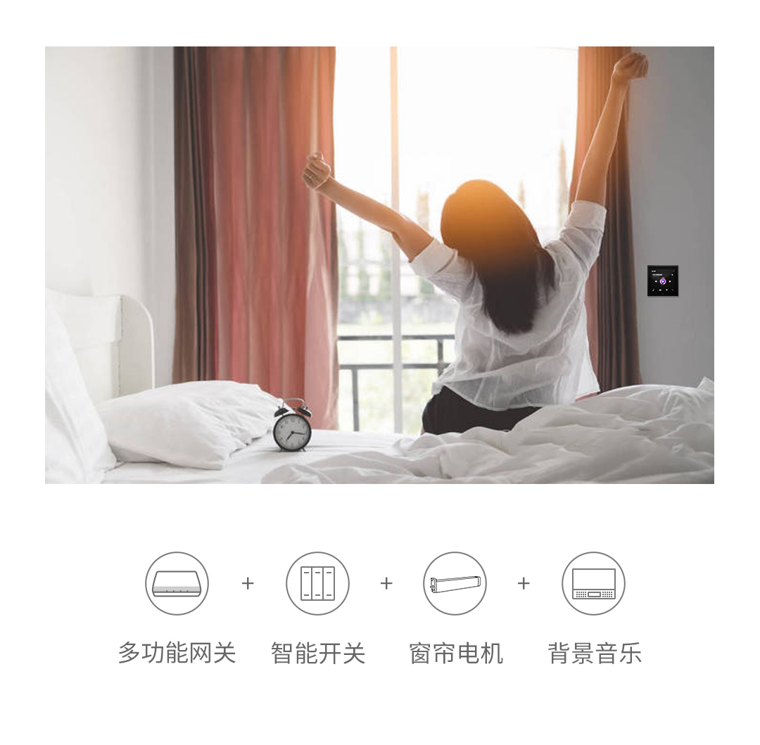 智能轻触面板,能够自动开启灯光、一键操控灯光的开启或关闭,满足你对灯光的多种需求;还能搭配家中其他智能设备,实现场景联动控制。