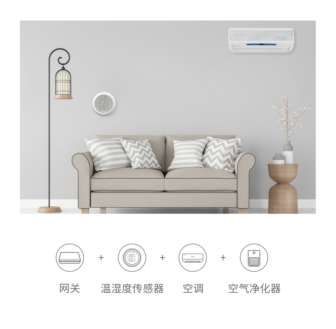 温湿度传感器能够实时感知温湿度的变化,当温湿度过高或过低时会及时提醒你,时刻关心你的身体健康;还能通过多功能网关,联动其他智能设备执行智能场景。