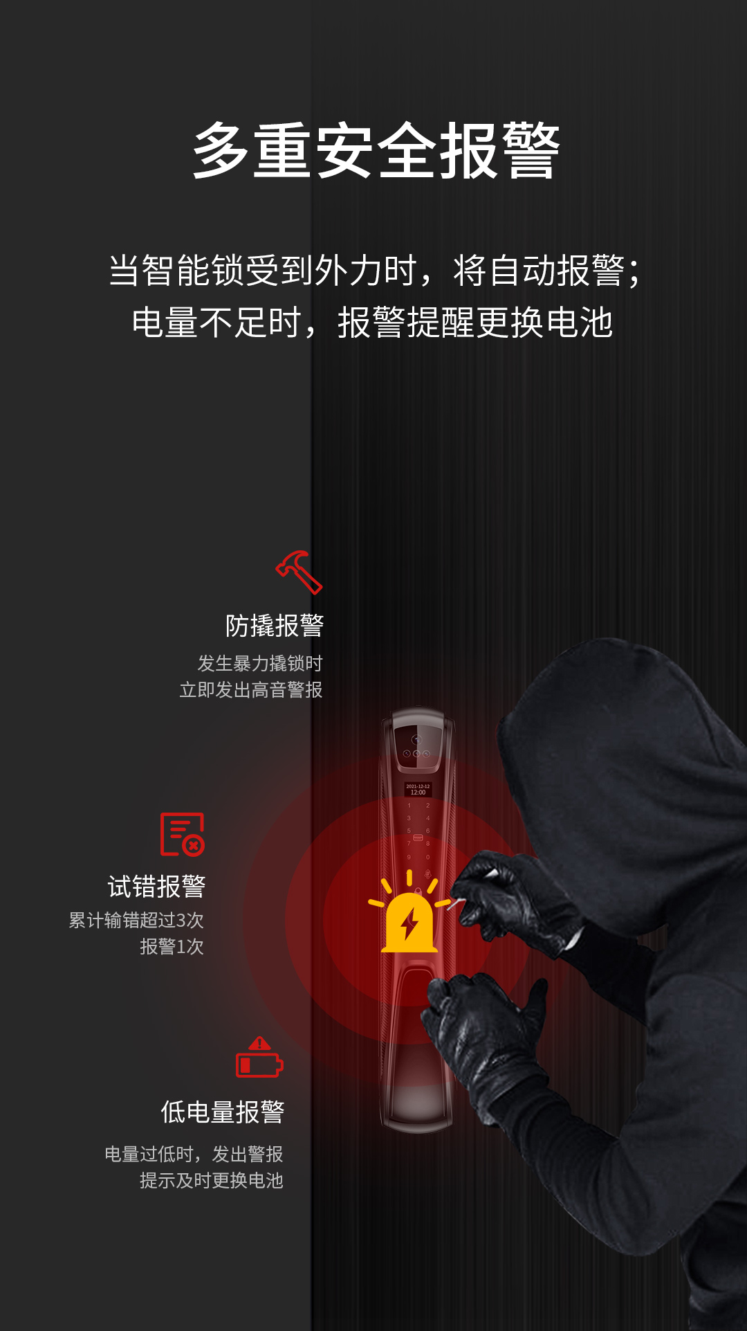 当智能锁受到外力时,将自动报警,并推送信息至手机。另外,智能门锁还设置有低电量报警、密码输入错误报警等功能。