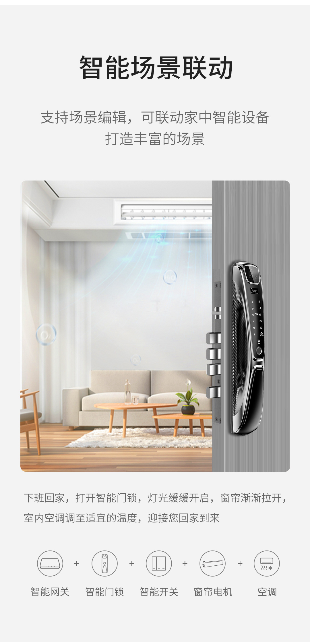 智汇云智能门锁,还能联动家中智能设备打造丰富场景。设置场景时,还可添加“任意门锁用户的开门动作”作为触发条件。当该用户打开门锁后,即可实现设置好的智能场景,比如回家场景。