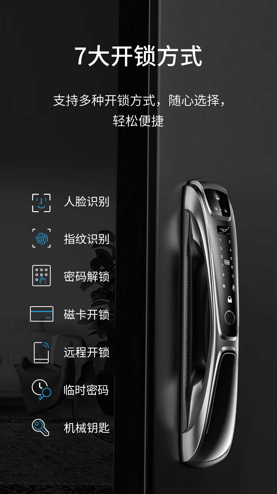 除了人脸识别开锁,智汇云智能门锁还支持指纹、密码、刷卡、远程、临时密码、钥匙开锁等丰富的开锁方式,用户可随心选择。