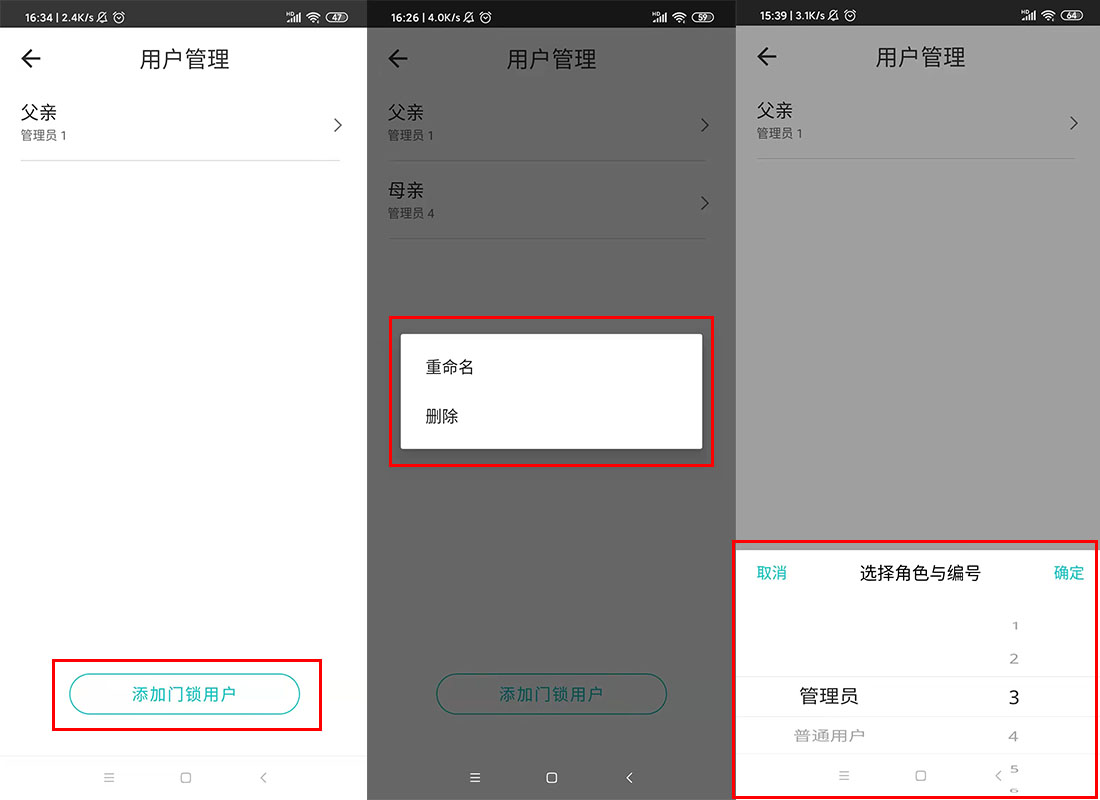通过手机APP,我们还可以管理门锁用户,包括添加、删除和重命名用户,以及设置用户管理权限。比如添加用户“父亲”后,当“父亲”开启门锁,将立刻推送开锁信息至手机。