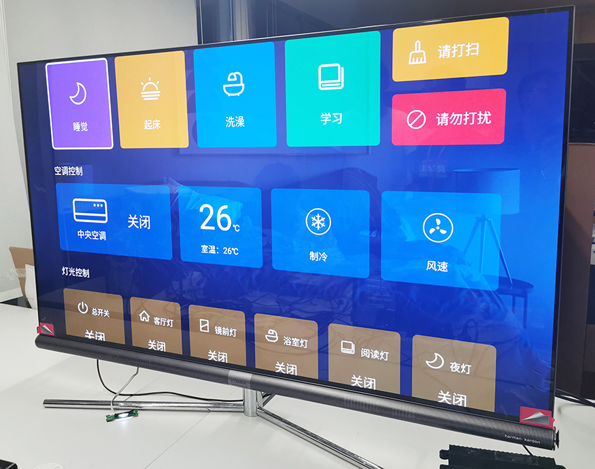 同时,酒店可为客户预设场景模式,例如:阅读模式、睡眠模式、起床模式、休闲模式等;场景模式的执行可由智能面板按键、康佳远场语音声控智能电视的语音控制以及电视控制界面来实现。